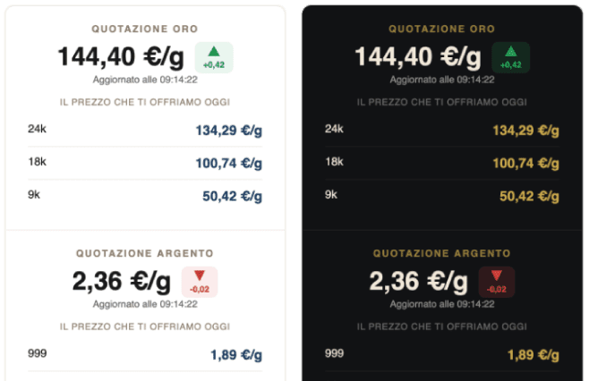 - Mostra i prezzi live di oro e argento in €/grammo senza costi di API esterne